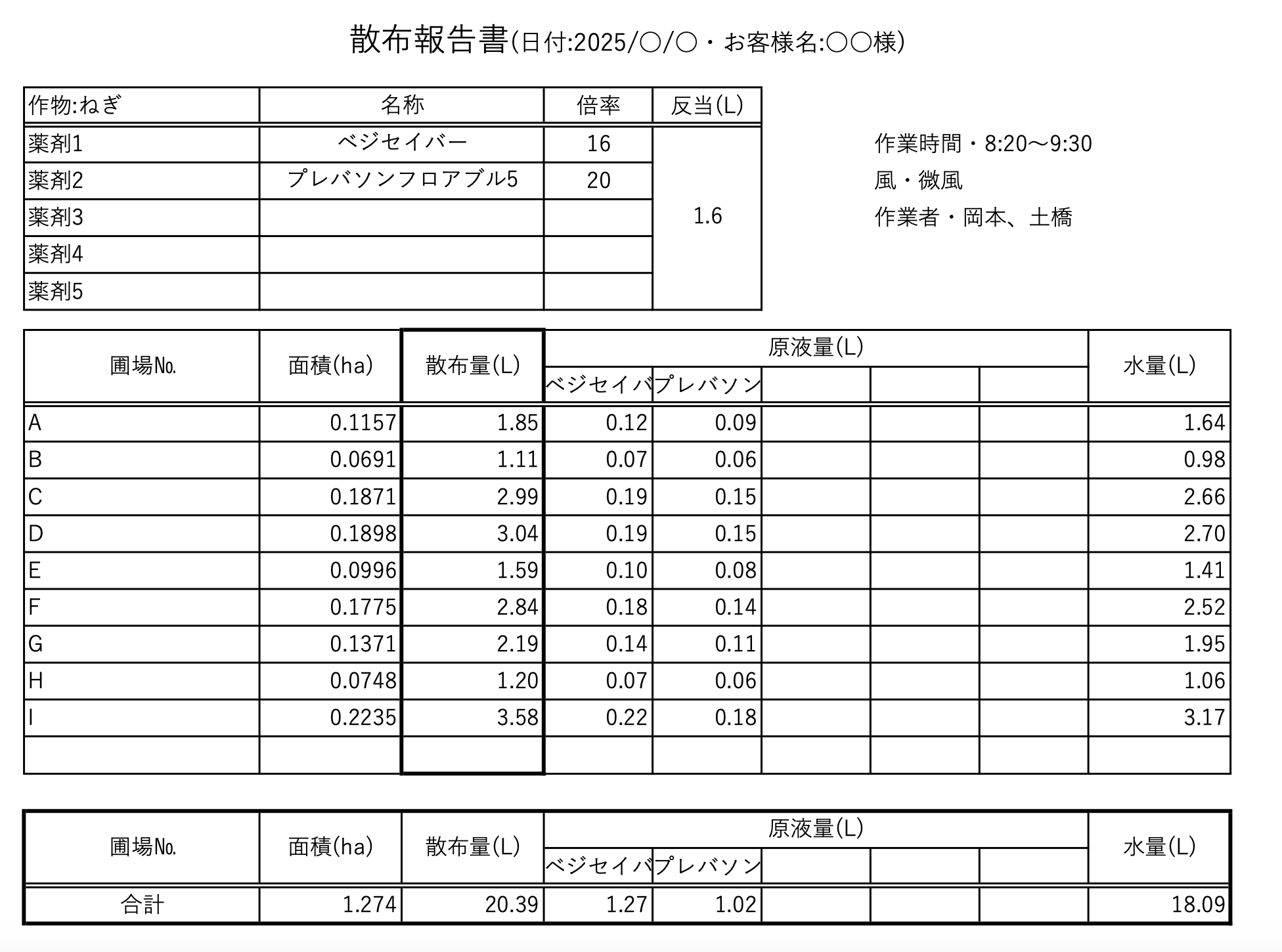圃場ごとに厳格に散布量を管理し、グローバルギャップに有効な散布報告書を発行いたします。